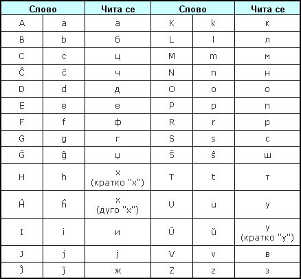 Pored standardnih latiničnih slova koriste se i slova sa "kapicama": ĉ, ĝ, ĥ, ĵ, ŝ, ŭ, koja se čitaju kao naša: č, dž, h, ž, š, u.