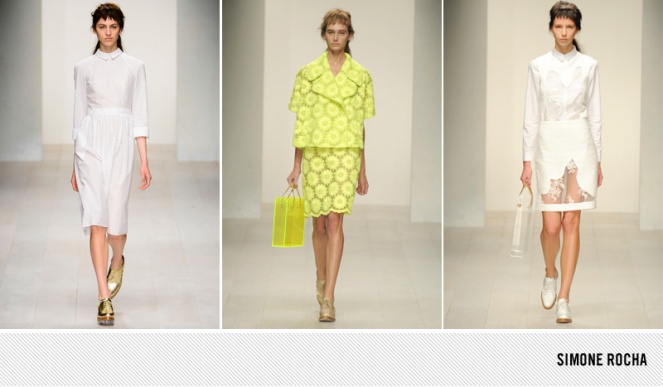 Simone Rocha je za sezonu proleće/leto 2013. bila inspirisana tinejdžerima, i baš zbog osećaja čistoće većina njenih modela je bela, a manekenke nose oreole. Veoma romantični i veoma nosivi modeli, a ko ne voli belu, tu su i jake letnje boje...