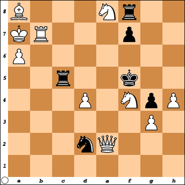 Dama b5. Ako top jede damu onda beli top b5 mat. Ako cni skakac e4 onda dama d7. Ako crni f6 onda beli skakac d6.