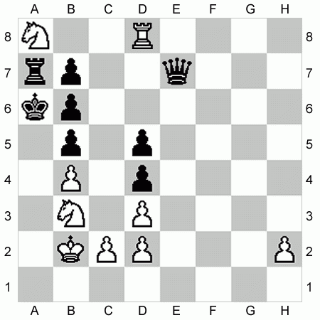 1. Te8, De5 (brani mat Sc7 i brani Te1 sa matom na Ta1)2. Tf8, Df4 (isti razlog kao u 1. potezu)3. Tg8, Dg3 4. Pg3 (pešak jede damu), Ta8 (top jede skakača)5. Ta8# Ili 3. Tg8, Dama ne ide na g3 4. Tg1, ...5. Ta1#